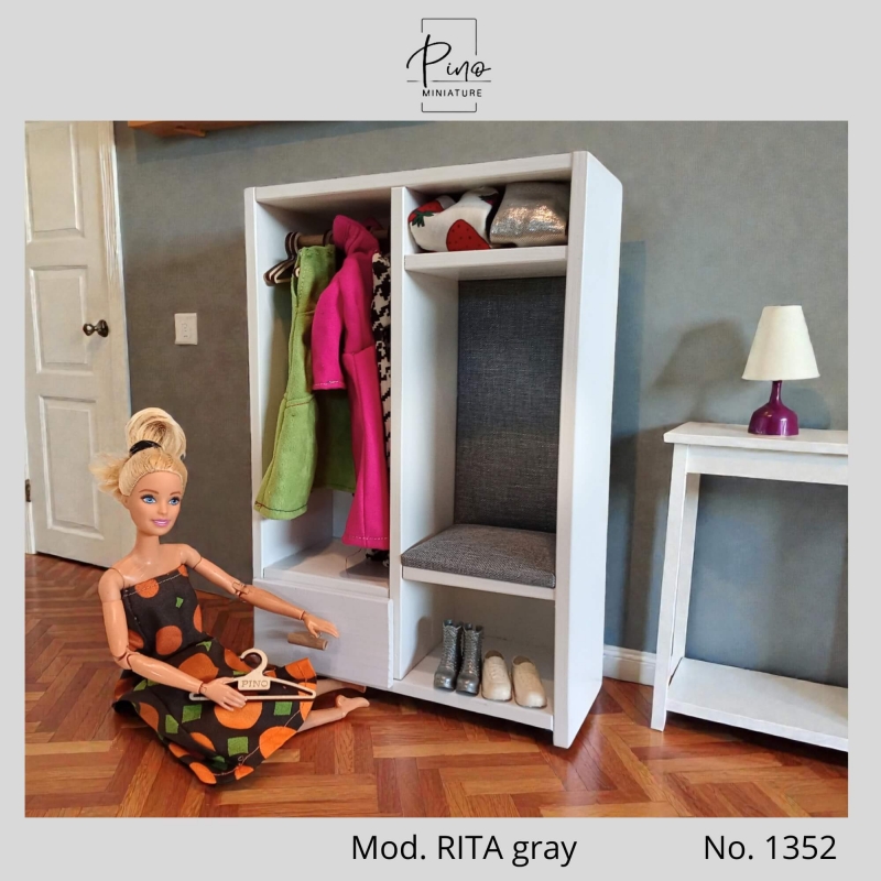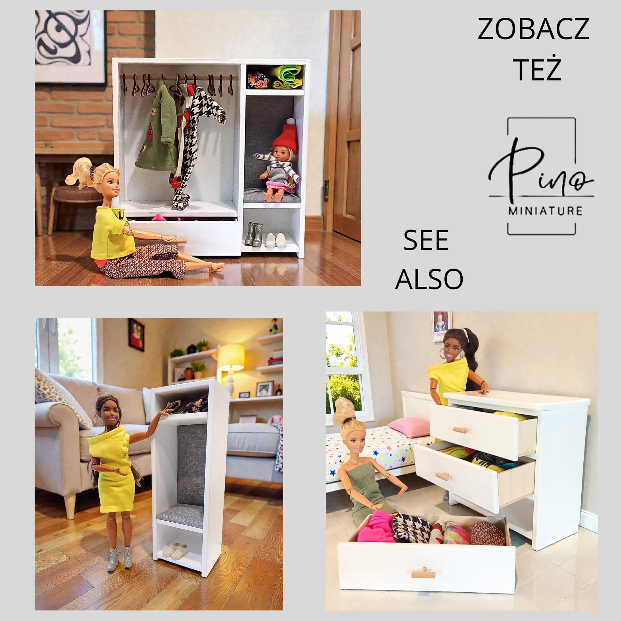 W wersji Garderoby model RITA dużo się dzieje. Macie tutaj nie tylko miejsce na buty dla lalek czy półkę na czapki i szaliczki ale i miejsce na powieszenie odzieży typu płaszczyk , sukienka (gratis do zestawu dołączamy 5 drewnianych firmowym wieszaczków) . Dodatkowe rzeczy schowasz w głębokiej szufladzie. Oczywiście nie mogło zabraknąć wnęki z tapicerowanym siedziskiem i oparciem jako forma ławki gdzie lalka może usiąść i spokojnie założyć buty. Myślę że ta garderoba znajdzie też inne zastosowanie niż w przedpokoju . Co wy na to żeby była elementem pokoju lalki , a we wnęce mogłaby znaleźć chwilę spokoju na poczytanie np. fajnej książki. Czemu nie. A może jako fajny mebelek dla Ciebie lub kogoś ci bliskiego: Model RITA chętnie pomieści twoją biżuterię , postawisz na niej swoje perfumy , schowasz kolczyki. Możliwości jest bardzo dużo - nie pozwól by wyobraźnia cię ograniczyła. Zobacz TUTAJ na modelu GAYA - przeznaczenie na biżuterię