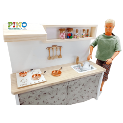 Na długim drewnianym blacie wykonanym z drewna jesionowego osadzono pojemny zlewozmywak który pomieści : patelnie , talerzyki , naczynia do mycia. Pomocny będzie ruchomy drewniany kran. Tuż obok na blacie osadzono 4 palniki drewniane na których gospodyni może postawić garnki i gotować obiad. Nad palnikami mamy piękny duży drewniany okap. Możemy wygrawerować na nim dowolny napis.Obok okapu zamontowana jest wisząca szafka, która pomieści sporo akcesoriów niezbędnych w kuchni : my umieściliśmy tam słoiczki .Słoiczki dostępne są w akcesoriach gdzie w komplecie jest 5 szt . Dolna część aneksu kryje za firanką 2 długie półki które dają duże możliwości wypełnienia waszymi akcesoriami niezbędnymi w kuchni. Całość wykonana jest z dwóch rodzajów drewna : sosnowego i jesionowego i prezentuje się bardzo okazale . Aneks świetnie uzupełnia inne mebelki drewniane z kolekcji PINO . To duży mebelek który na pewno was zachwyci.