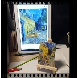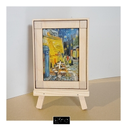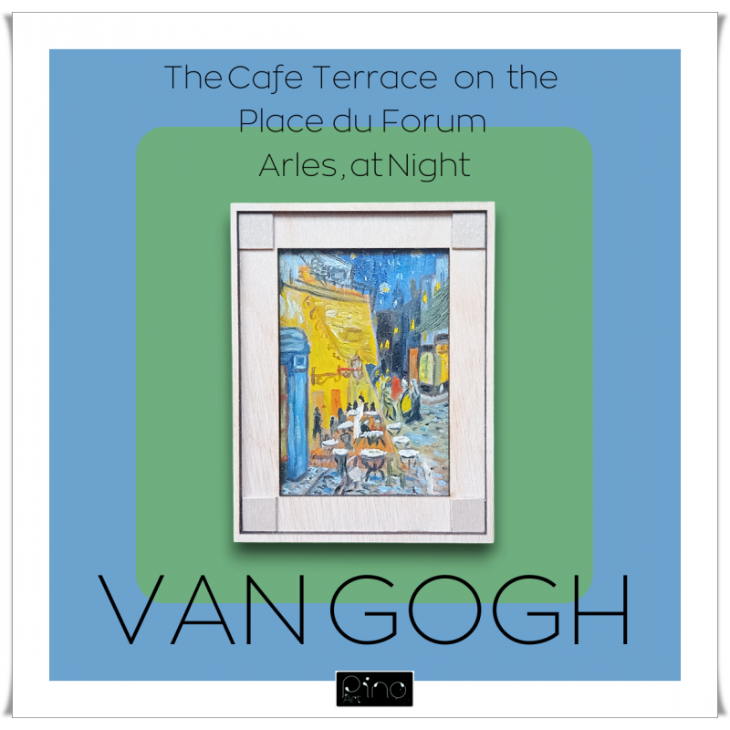 Tym razem w twojej galerii domku może zagościć obraz "The Cafe Terrace on the Place du Forum , Arles , at Night - Taras kawiarni w nocy w Arles. Obraz jest wstawiony w ramie, która jest odwzorowaniem oryginalnej ramy z muzeum w Kroller- Muller Museum w Otterlo w Niderlandach. Praca malowana farbami olejnymi . Obraz jest zabezpieczony werniksem.