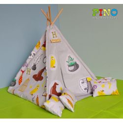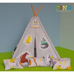 9 ELEMENTÓW ZESTAWU :tipi: 1 szt. patyczki z drewna bukowego : 4 szt. poduszki : 4 szt.