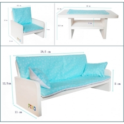 Mebelki z serii turkusowej są częścią kolekcji mebelków drewnianych do domku lalek . Tkanina w malutkie białe kwiatuszki na tle soczystego koloru morskiego.