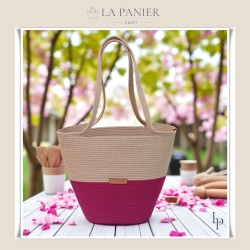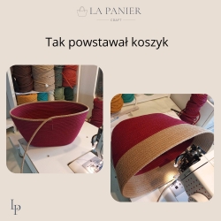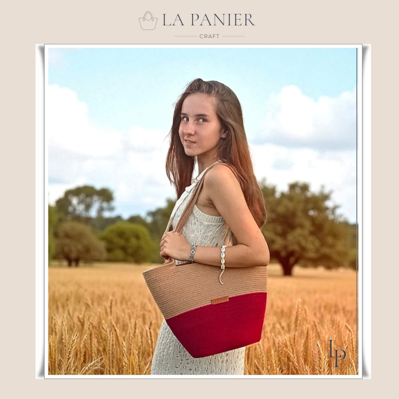 Koszyk szyty ręcznie ze sznurka w 2 kolorach wiśniowym ( w kolorze wina) w połączeniu z kolorem cappucino . To połączenie sprawia że torba jest elegancka i idealnie będzie pasować zarówno do pracy jak i na lunch czy wyjście z koleżankami na miasto . Torba podkreśli twoją codzienną garderobę .