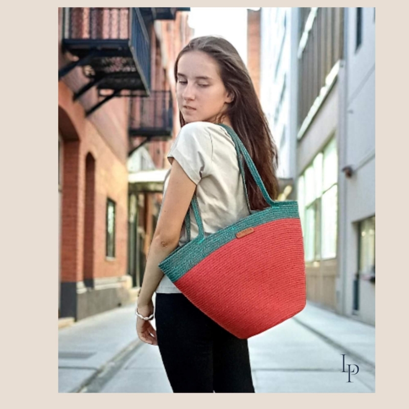 Torba na ramię ręcznie szyta ze sznurka w kolorze koralowym ( arbuzowym) w połączeniu z melanżem morskim.